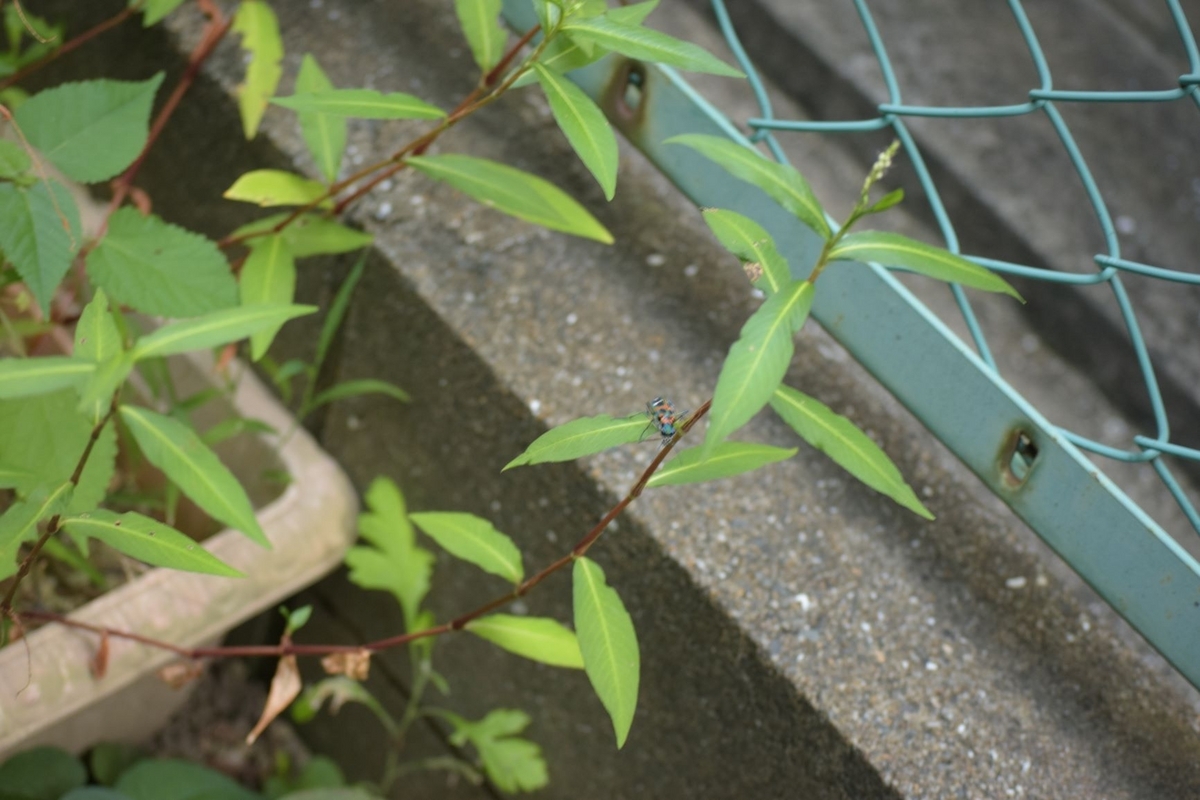 路地をぴょんぴょん飛んで、オオイヌタデの葉っぱに飛びついたところ。